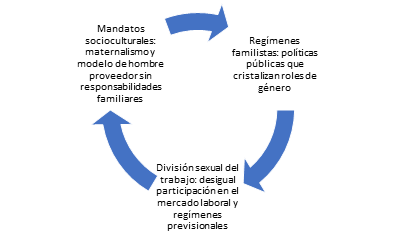 Los componentes identificados se refuerzan mutuamente y dan lugar a la dinámica que se observa en la organización social del cuidado en forma generalizada en la región. Los mandatos socioculturales son los responsables del maternalismo y familismo alrededor de los cuidados. Dichos mandatos de género se expresan públicamente en políticas públicas que, en su mayoría, cristalizan los roles de género que asignan y responsabilizan a las mujeres como cuidadoras primarias relegadas al ámbito doméstico. Esta carga desproporcionada de cuidados condiciona las oportunidades de las mujeres en el ámbito laboral, educativo y profesional, afectando su autonomía económica, su libertad, igualdad y dignidad. Contribuir a desmontar cada uno de estos mecanismos requiere de acciones diferenciadas.
