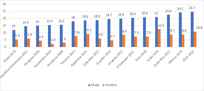 Gráfica 1. Diferencias en el uso del tiempo en trabajo doméstico y de cuidados entre hombres y mujeres, América Latina, último período disponible.
