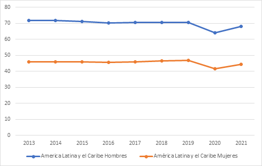 Gráfica 2. Tasa de ocupación por sexo (tasa anual media), evolución en América Latina: 2013-2021
