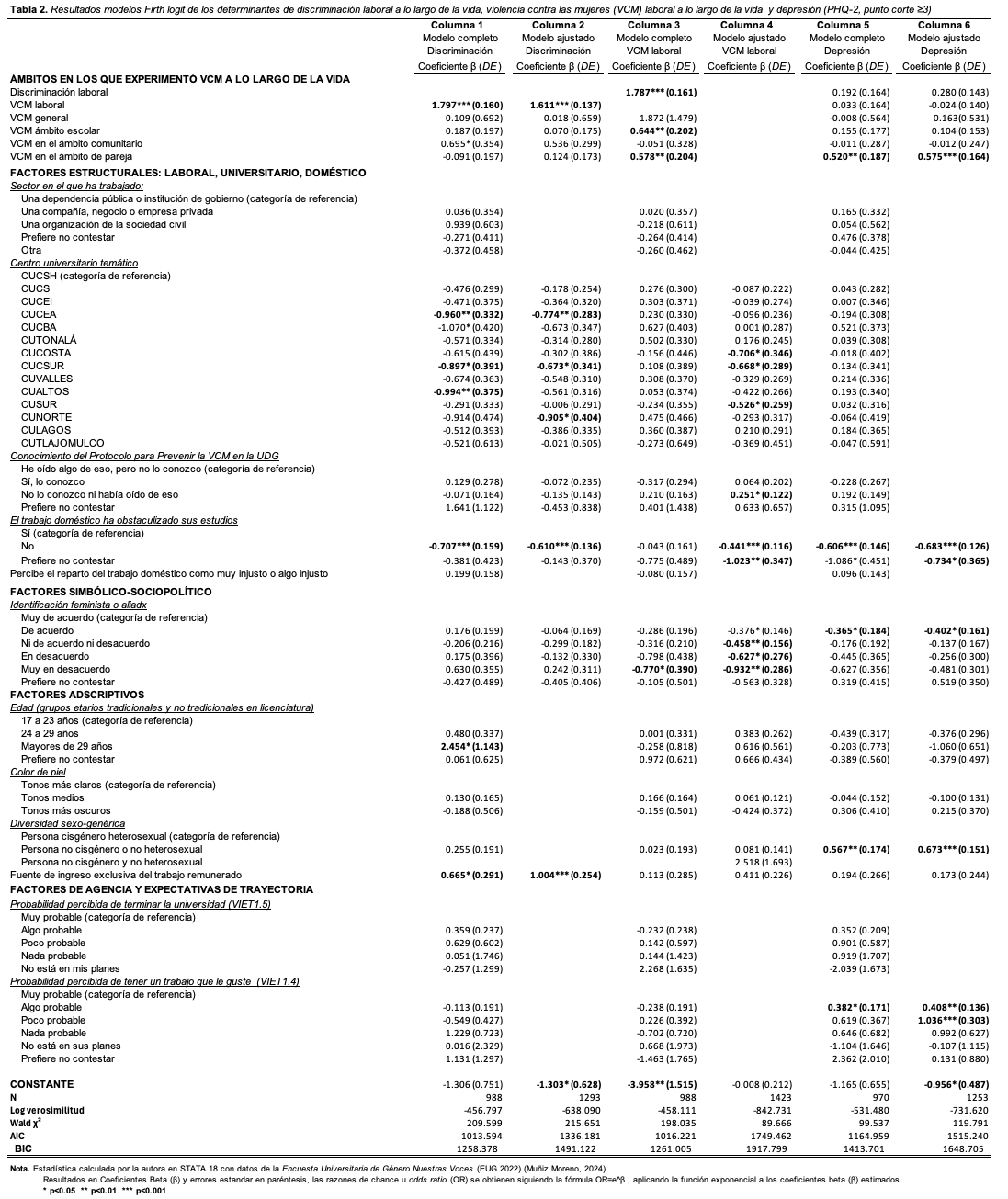 La discriminación y violencia laboral contra mujeres universitarias representan un desafío estructural para las Instituciones de Educación Superior (IES). Este estudio, desde un enfoque feminista, interseccional y de derechos humanos, analiza datos de la Encuesta Universitaria de Género, Nuestras Voces (Muñiz Moreno et al., 2022). Mediante regresiones logísticas multivariadas, se identifican factores asociados a la violencia, discriminación y síntomas depresivos. Los modelos incluyeron variables adscriptivas, estructurales, simbólicas, de agencia y de expectativas. Los resultados muestran asociaciones significativas, destacando el peso de la carga doméstica, la identidad sexo-genérica, la autonomía económica, el contexto institucional y la identificación feminista. Se concluye que las IES deben generar y aplicar información sistemática sobre desigualdades de género para intervenir eficazmente.Descargas
